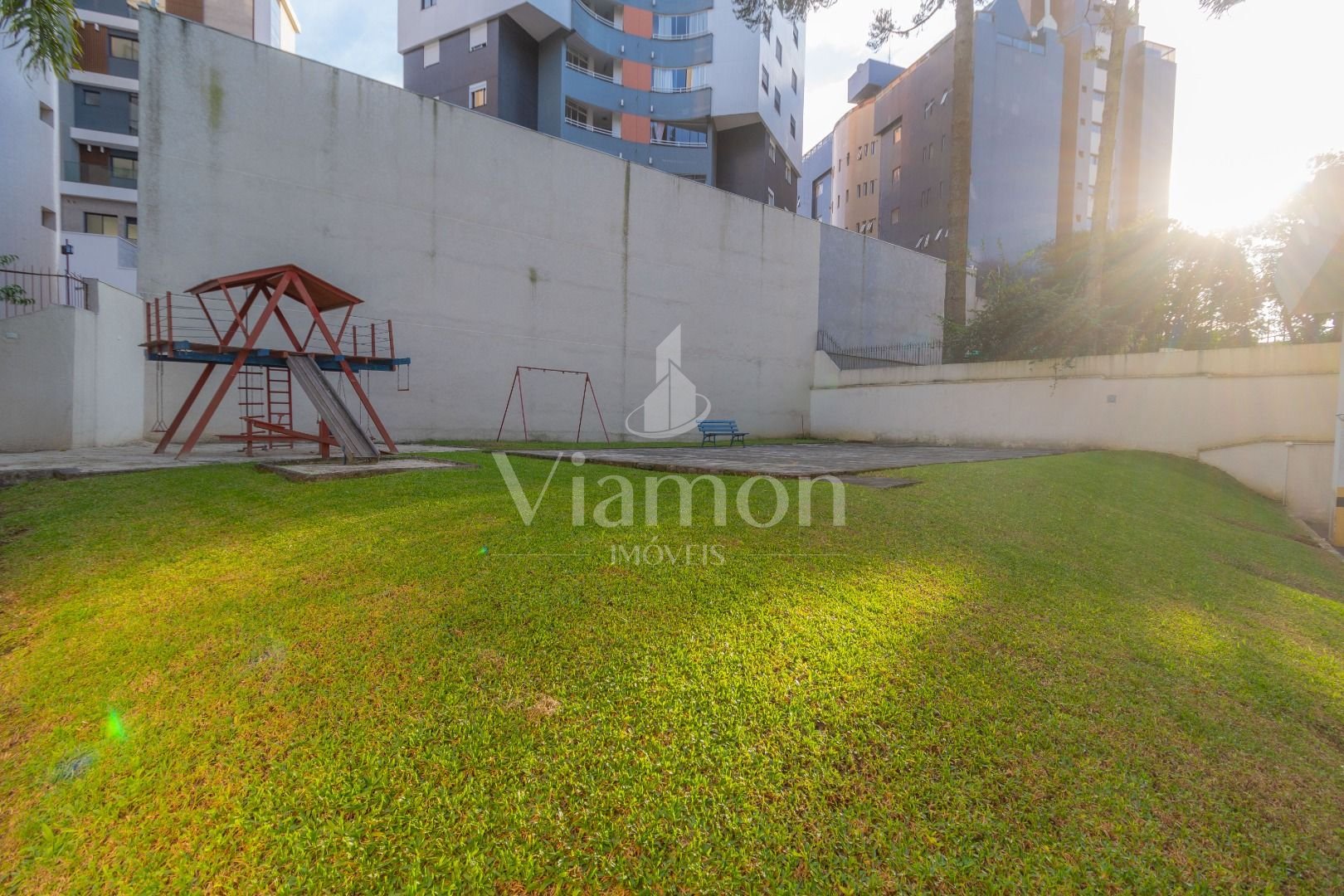 Playground com gramado impecável e jardim de entrada exuberante, remetendo a um Jardim de Monet.
