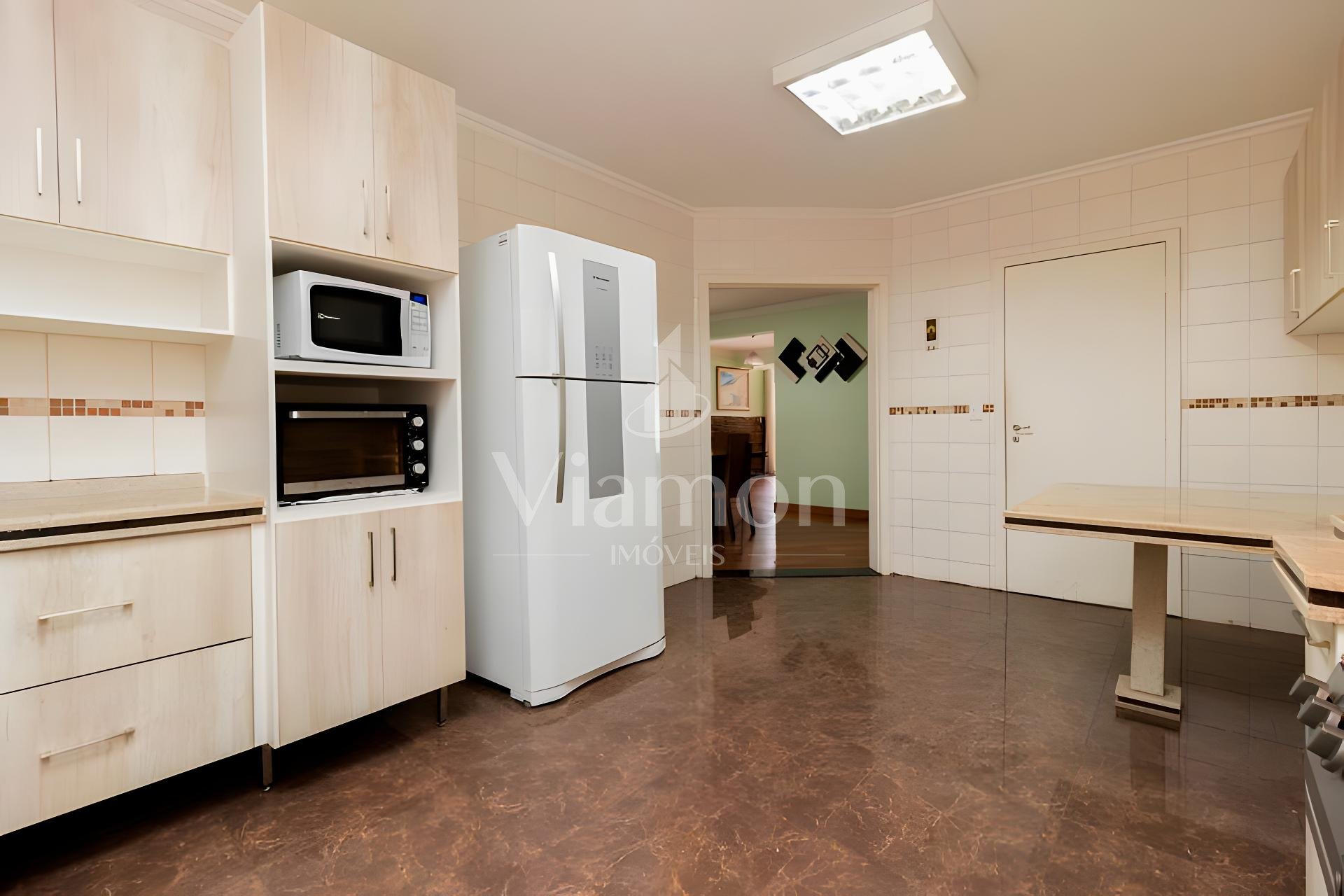 Cozinha espaçosa com armários planejados e bancada em mármore