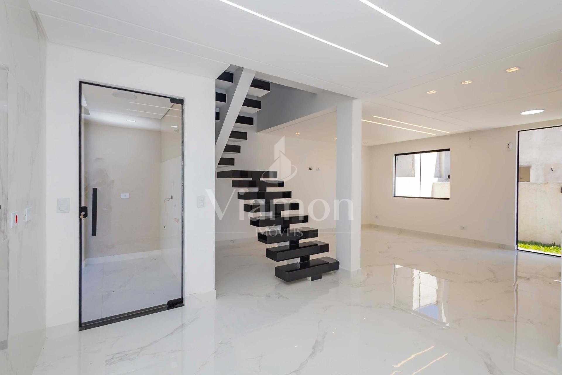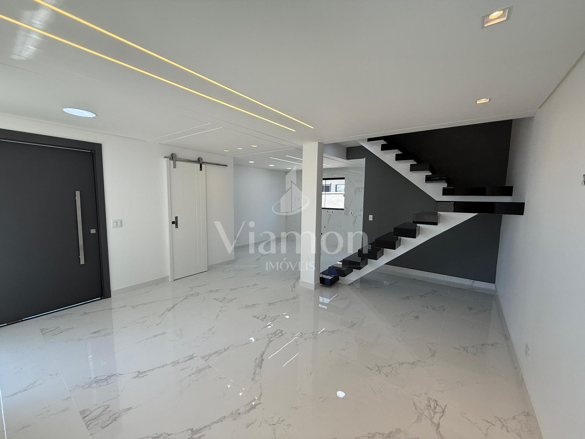 Terreo com sala de estar e jantar integrada com a cozinha que ja vem com balcao entregue, lavabo com bancada e cuba e metais entregues e a lavanderia.