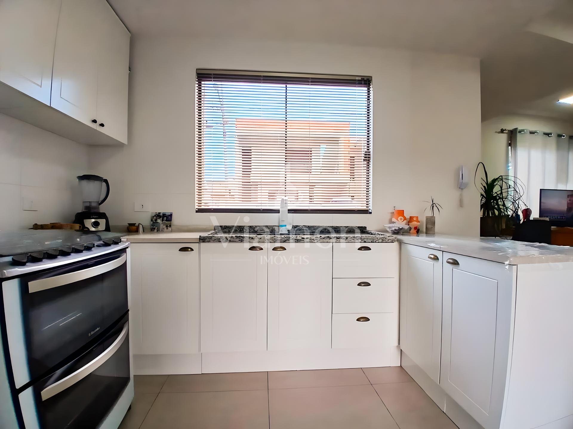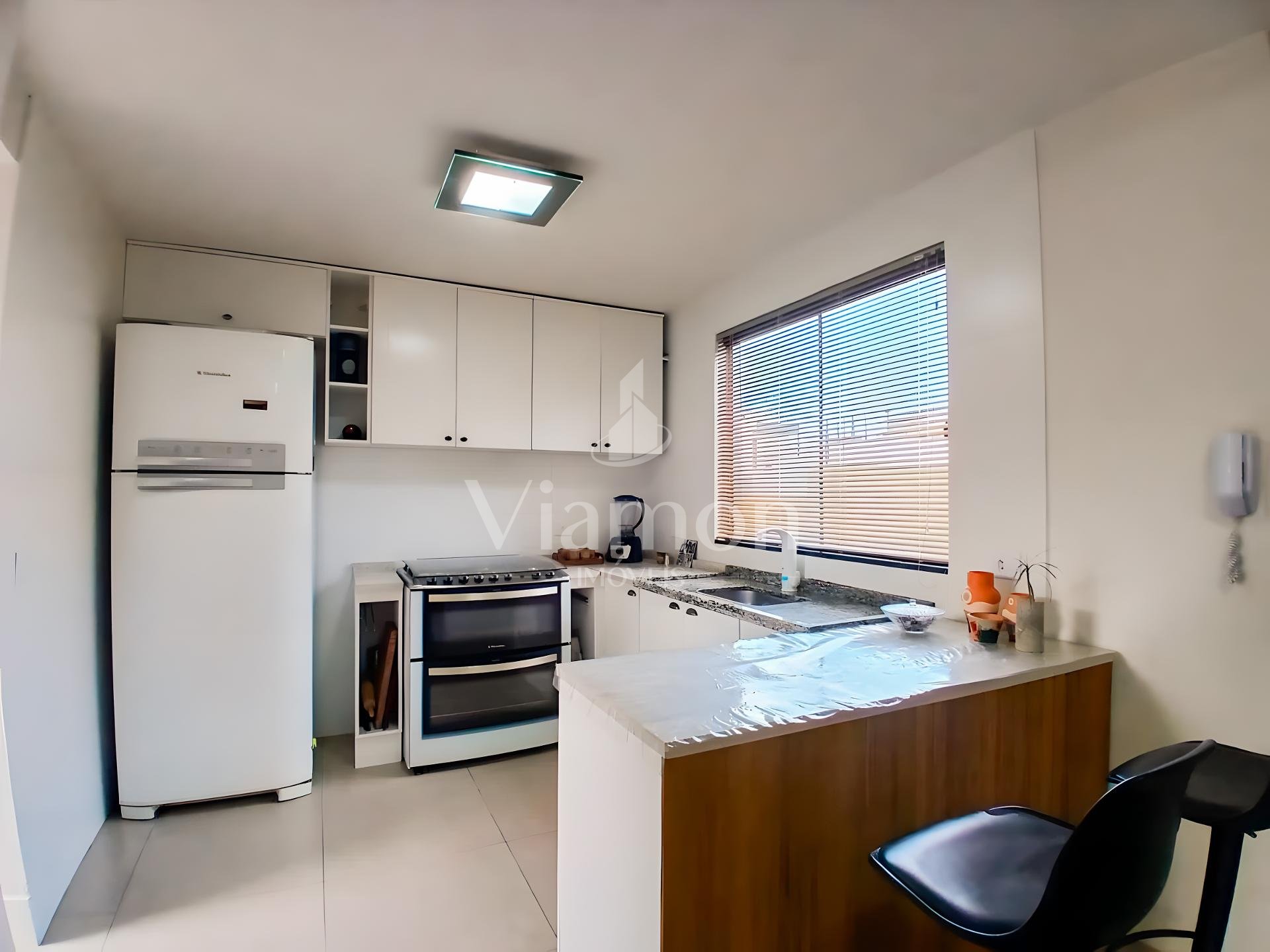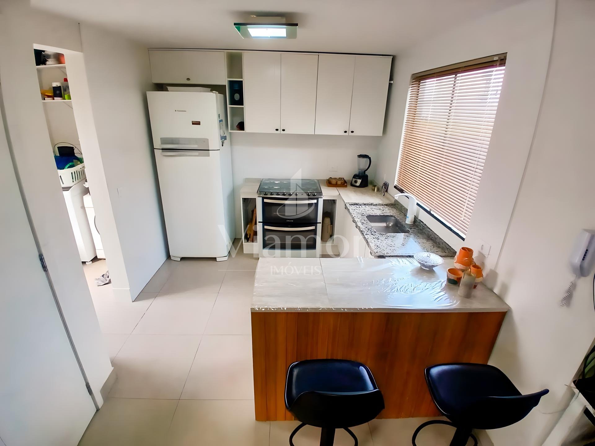 Cozinha americana com móveis planejados e bancada em granito.