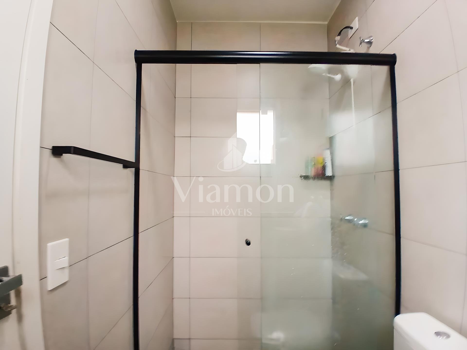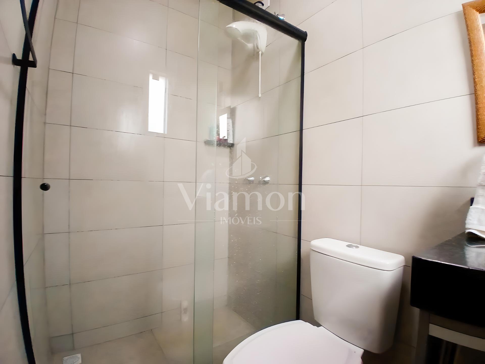 Banheiro social grande, também com armário e box.