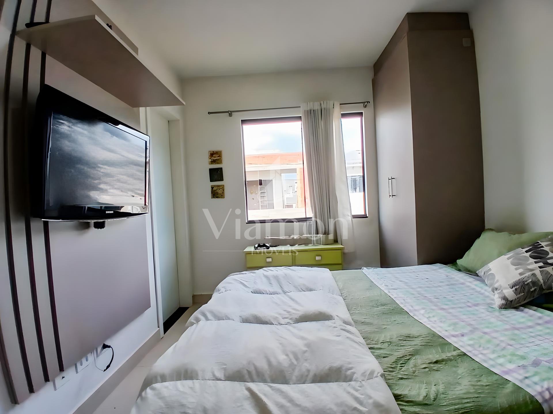 Suíte ampla com armários planejados e painel para TV.