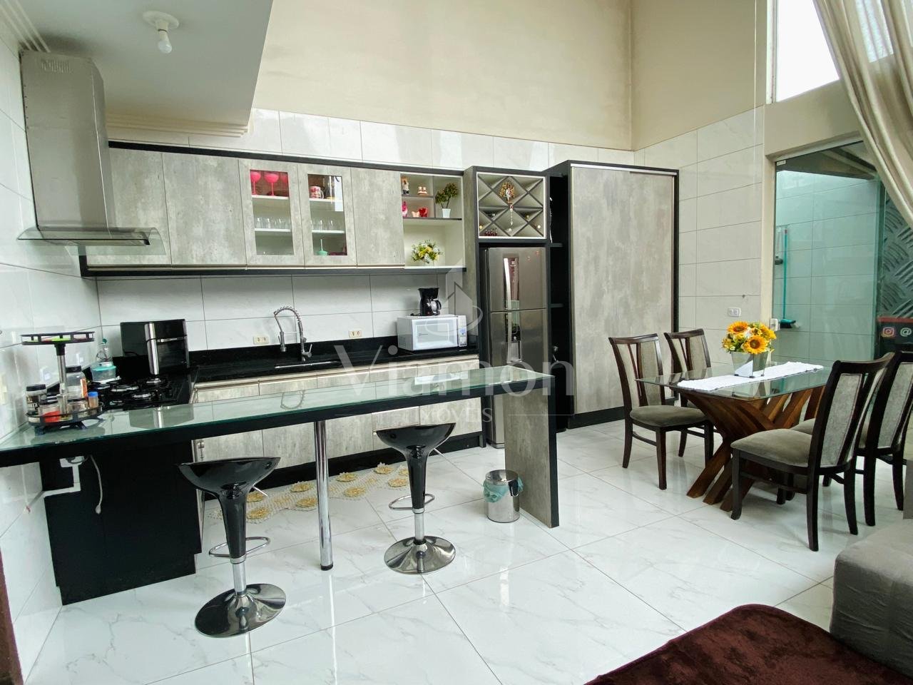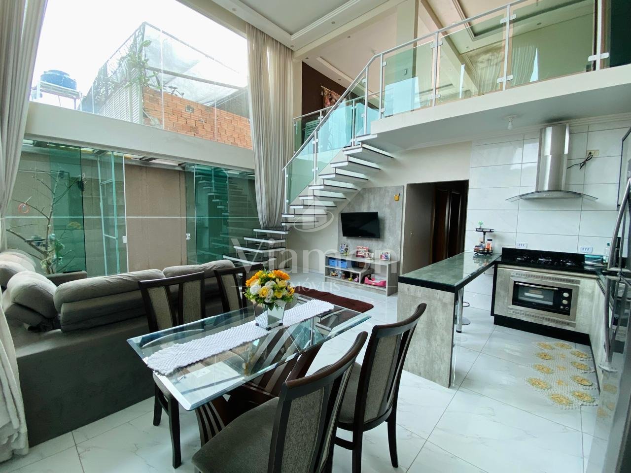 Conta com sala e cozinha integradas em conceito aberto e pé-direito duplo, que valoriza o ambiente e cria uma sensação única de espaço e sofisticação.