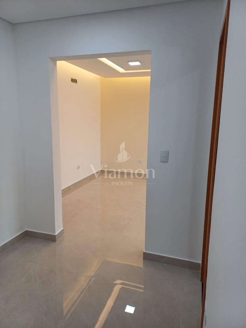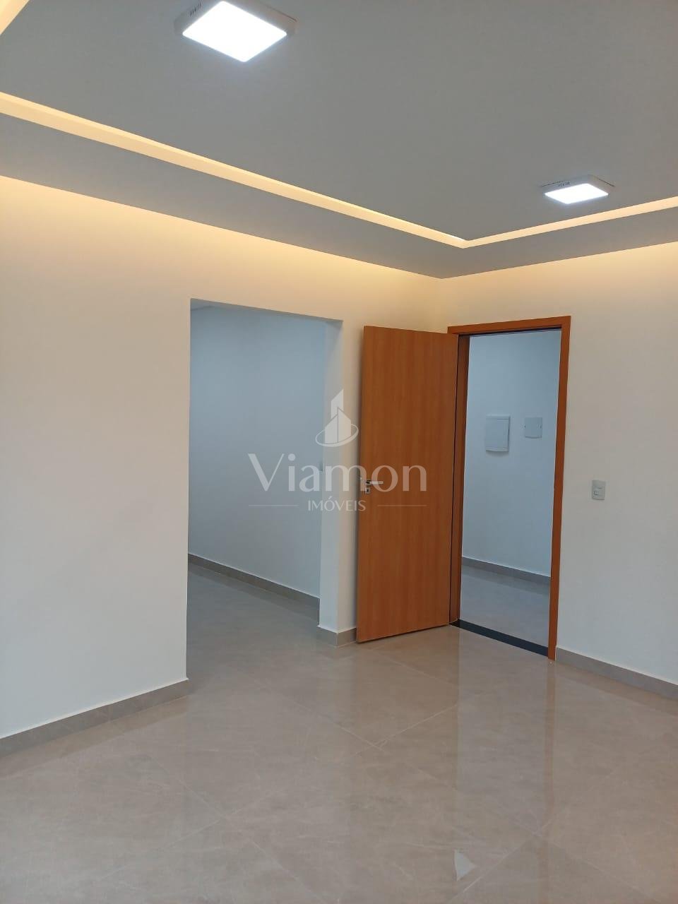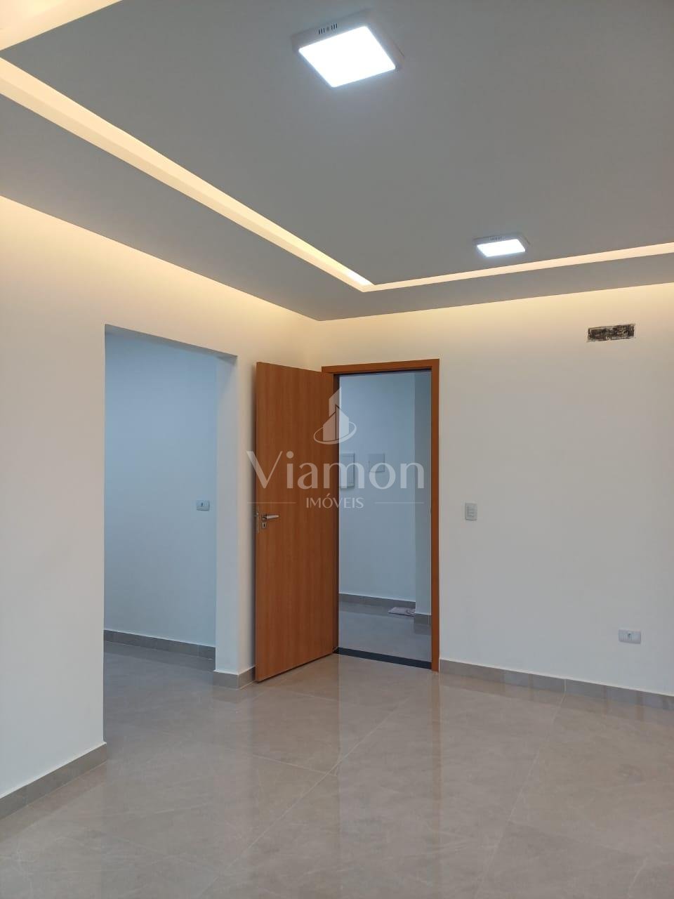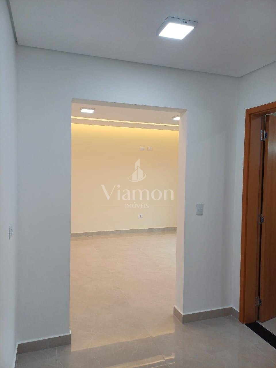 - Sala de estar, jantar e cozinha integradas com acabamento em gesso e iluminação embutida