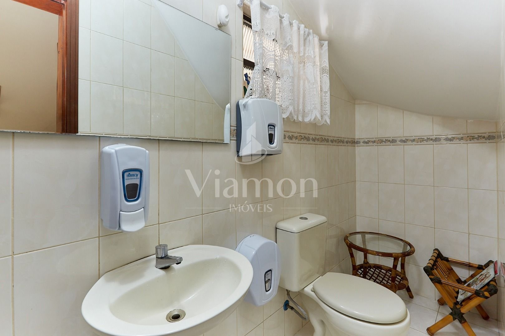 Banheiros: social no piso superior com box de vidro e lavabo no térreo.