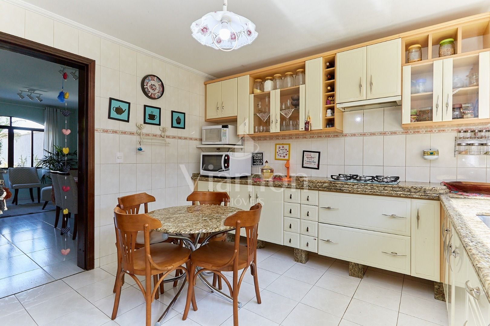 Cozinha com armários planejados e área de serviço bem ventilada.